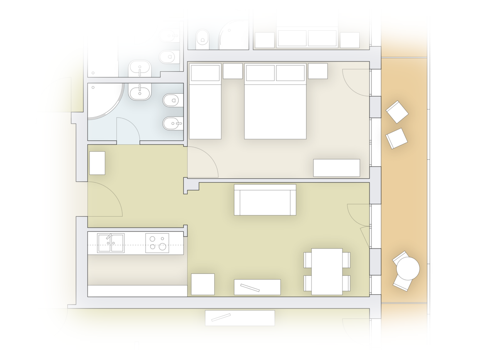 L’appartamento è composto da una zona giorno con divano letto, angolo cucina, un terrazzo, una camera da letto, un bagno con box doccia, asciugacapelli e aria condizionata (con supplemento).