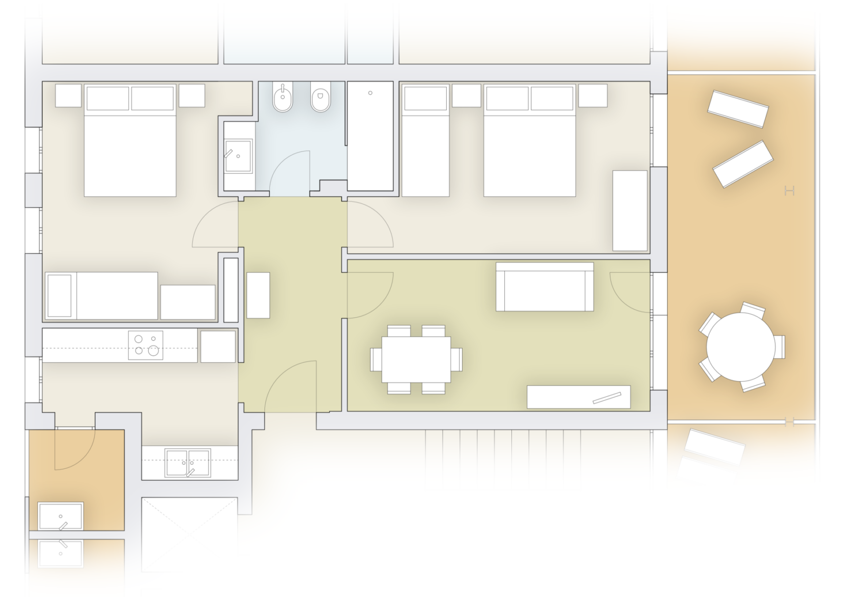 L’appartamento è composto da una zona giorno con divano letto, un ampio terrazzo dove è possibile pranzare all’aperto, una cucina con terrazzino, due camere da letto e un bagno appena rinnovato e ampliato dotato di box doccia e asciugacapelli.